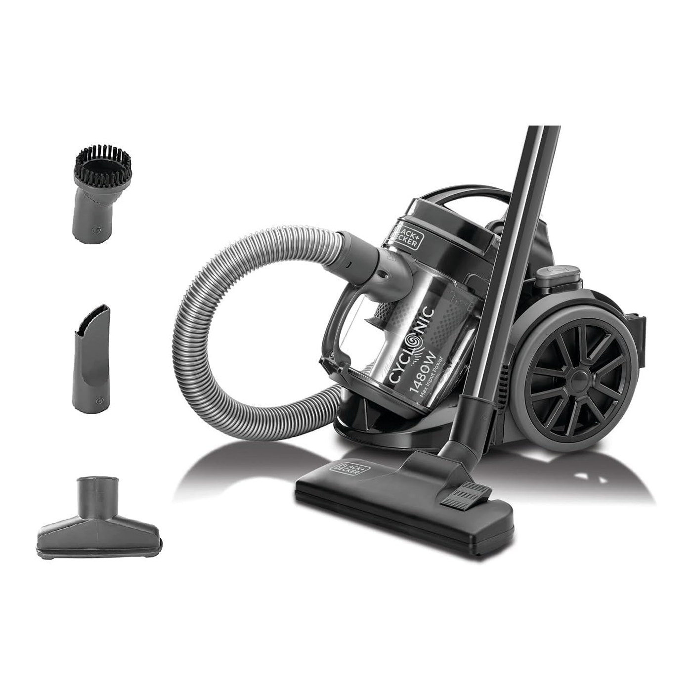 Black & Decker 1300W Vacuum Cleaner Black | Vm1480-B5 has a 6 stage filtration process with multi cyclone technology. With a 1.3 cubic meter/min airflow and suction power>18kPa, it is very effective. It comes with a 5m long power cable and a 1.5m 360 degree swivel hose for added convenience.