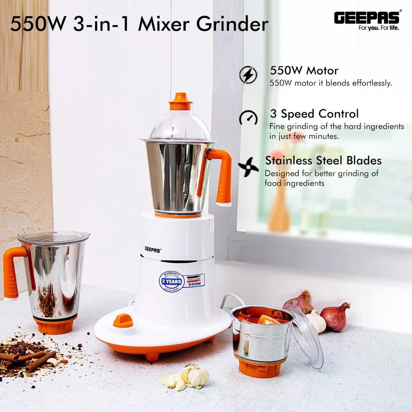Geepas 1.5L 3-in-1 Mixer Grinder 550W | GSB5080. Making Grinding fast and simple with Geepas Mixer Grinder – The grinder comes with 3 stainless steel jars with detachable razor sharp stainless steel blades for fast and fine grinding and blending, ideal for dry grinding, wet grinding and batter making. All jars come with unbreakable see through polycarbonate jar lids to prevent any leaks while operating. With its twist lock jar and motor unit with nylon couplings this grinder is really durable and sturdy. Use this appliance to prepare smooth gravies, chutneys, fine spice powders and a lot more.