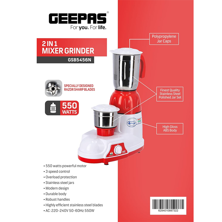 Geepas 2-IN-1 Mixer Grinder 550W | GSB5456
