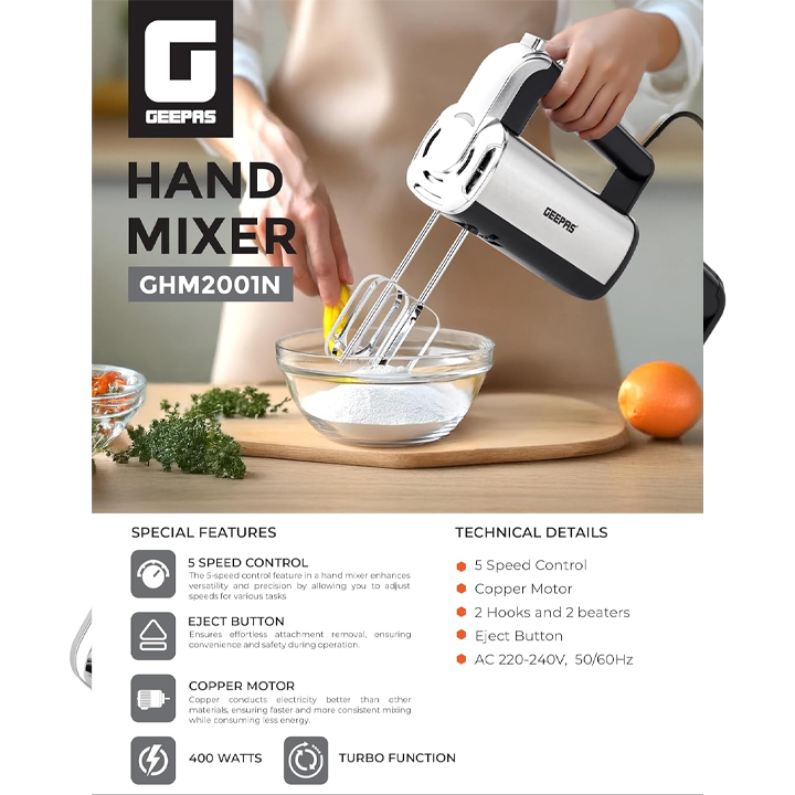| Item Type Name | Geepas 250W Hand Mixer – Professional Electric Handheld Food Collection Hand Mixer for Baking – 5 Speed Function, Includes Stainless Steel Beaters & Dough Hooks, Eject Button – 2 Years Warranty |