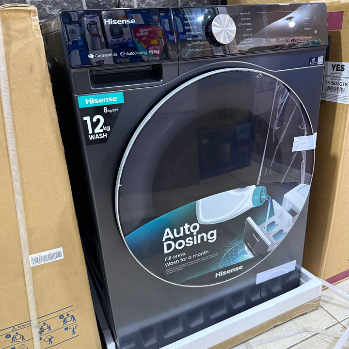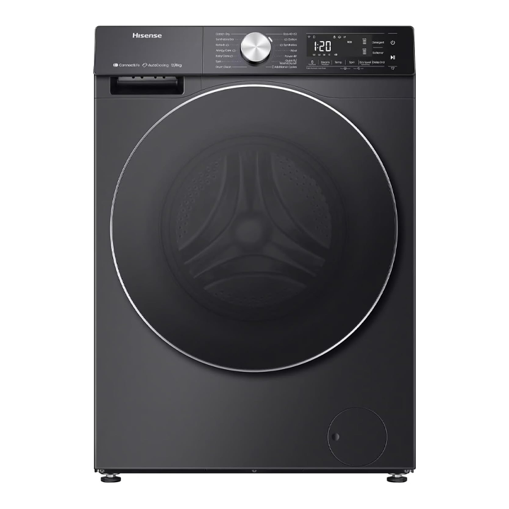 Hisense 2in1 12kg Washer and 8kg Dryer Washing Machine . Transform your laundry experience with this premium black Hisense WD5S1245BB washer-dryer combo. This sophisticated 2-in-1 appliance offers generous capacities of 12kg for washing and 8kg for drying, perfect for large households. The innovative jet wash technology ensures thorough cleaning, while the convenient Pause & Add function lets you include forgotten items mid-cycle. Featuring an advanced inverter motor, this machine delivers whisper-quiet operation with minimal vibration and optimised energy consumption. The steam refresh function helps reduce wrinkles, making ironing easier. The large, intuitive control display provides clear visibility of cycle status and easy operation. With remote control capability, you can manage your laundry from anywhere. Operating on 220-240V/50Hz, this elegant appliance combines functionality with modern convenience, making it an ideal choice for contemporary homes looking for space-efficient laundry solutions.