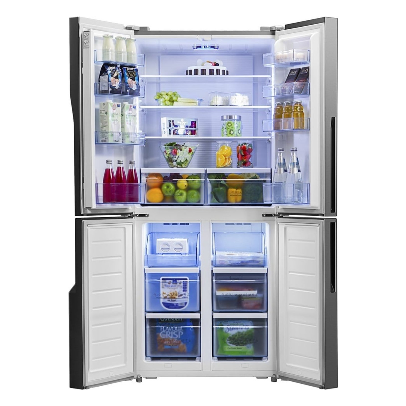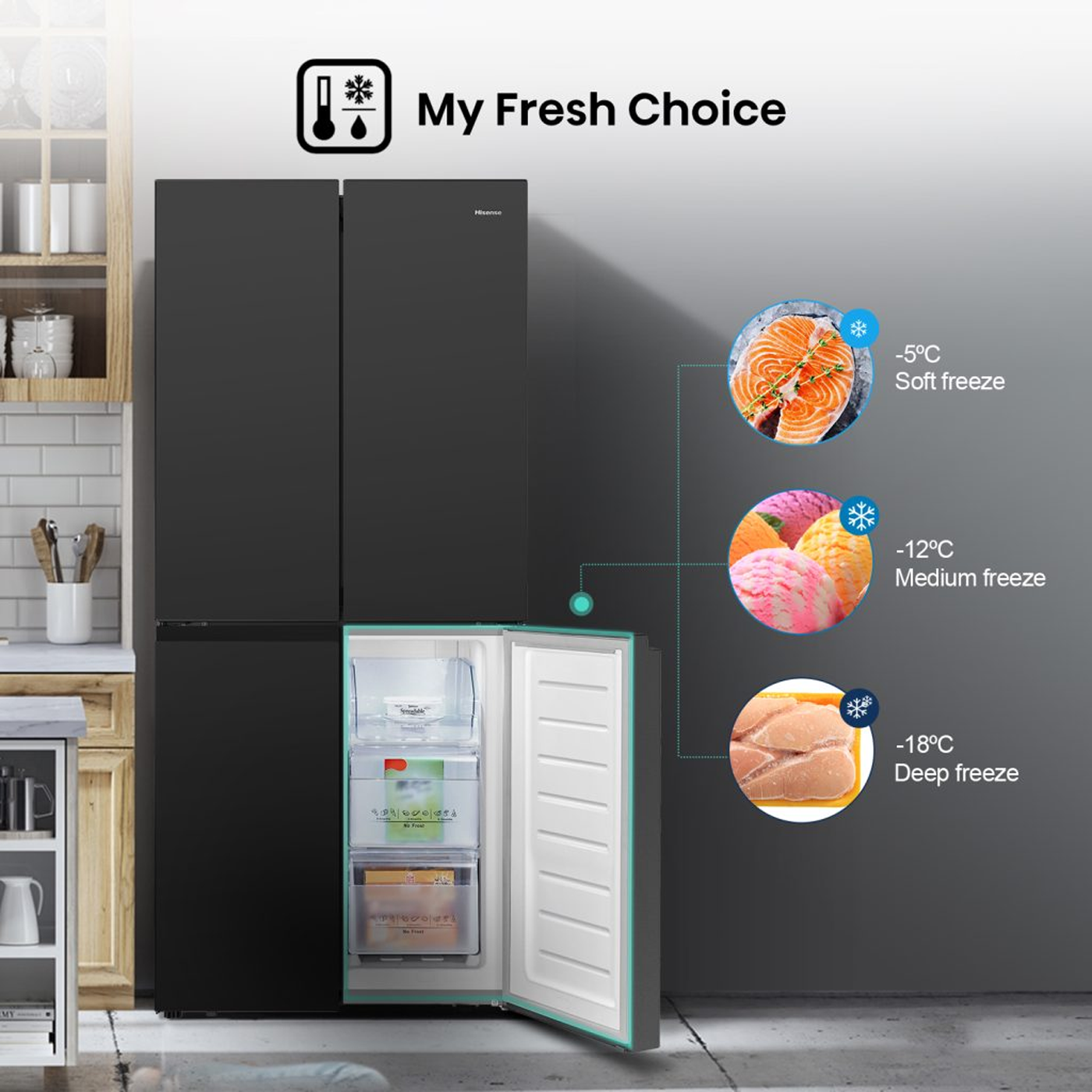 The Hisense 561L 4-Door Multi-Door Refrigerator (Model RQ561N4AB1) offers a spacious and stylish cooling solution for modern households. Featuring an elegant black glass finish and advanced cooling technologies, this refrigerator ensures food stays fresher for longer while adding a touch of sophistication to your kitchen.