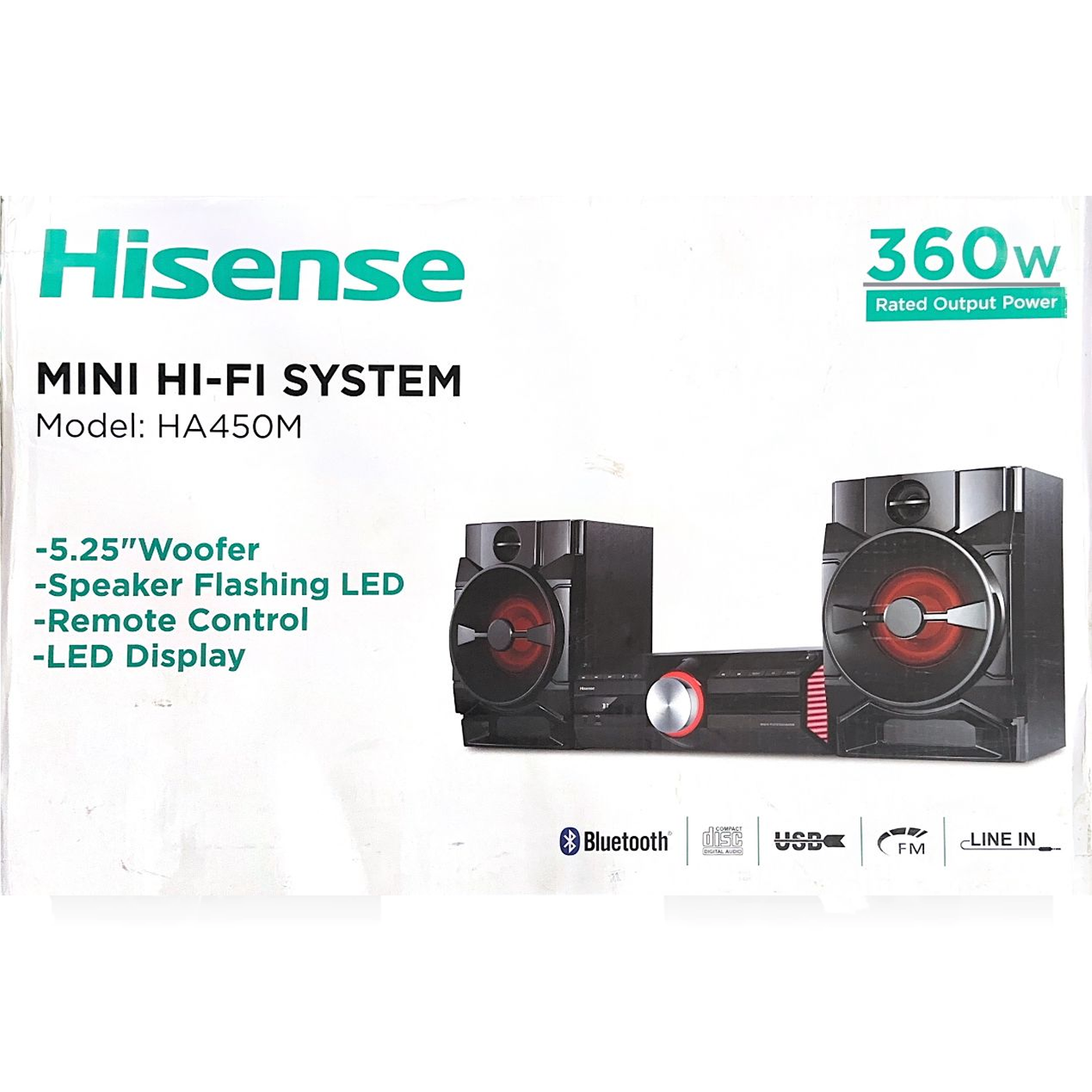 Hisense HA450 Mini HiFi System- 2.0 Channel Stereo Speakers, Total Power Output 360W (2x180w), USB Playback, Analogue FM Radio, Bluetooth Connectivity, 3.5mm AUX Input, LED Display Screen, Remote Control