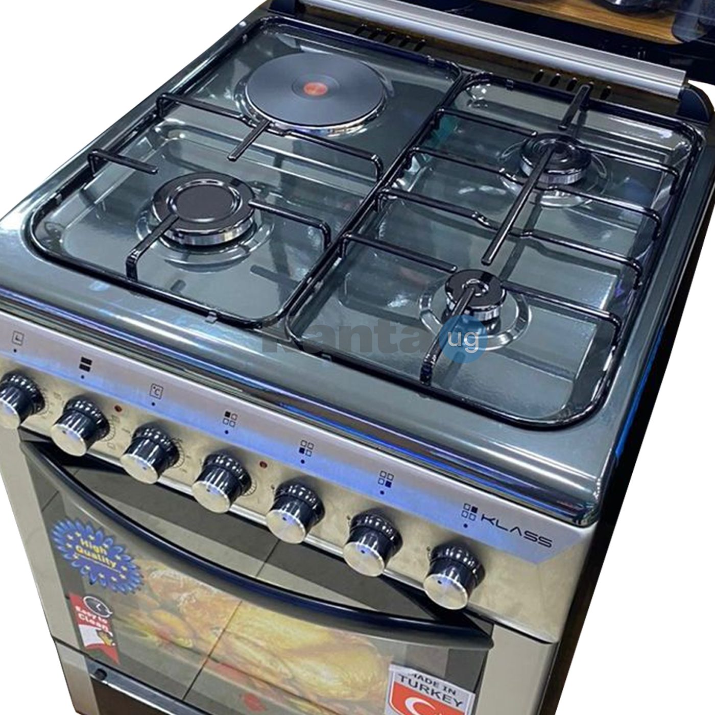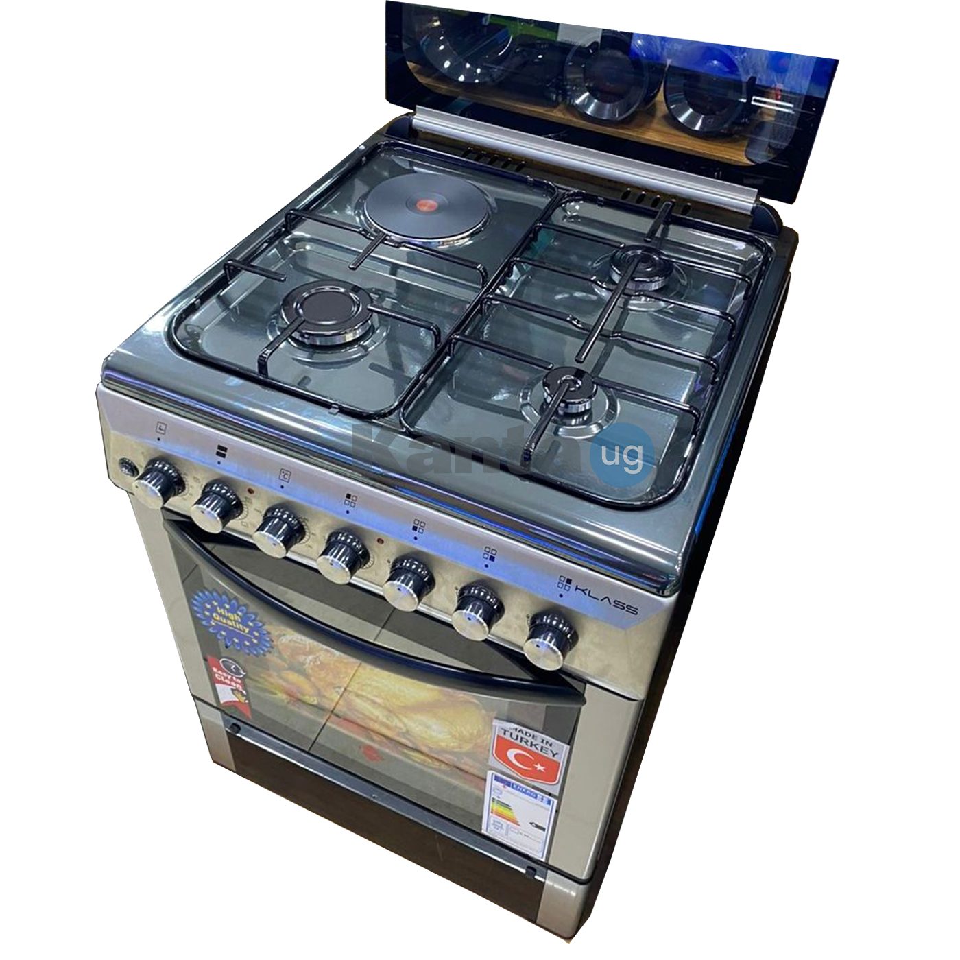 KLASS Cooker 60x60cm, 3 Gas Burners + 1 Hot Plate, Electric Oven & Grill, Rotisserie, Oven Lamp & Timer, Glass Top.