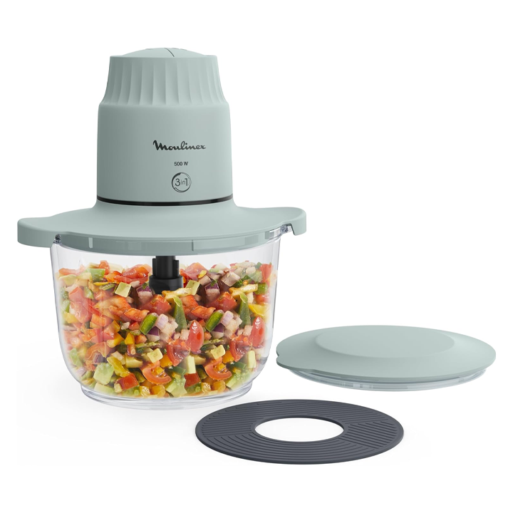 Discover the power of Chopper, the glass bowl chopper that chops, mixes and minces with smoothness and precision! Made for everyday use with a durable borosilicate glass bowl and a generous 1 L useful capacity, it delivers quick results thanks to its 4 stainless steel blades, powerful motor, and two versatile speeds. This 3-in-1 appliance brings versatility to your culinary adventures and allows you to handle wide range of ingredients—including cheese, nuts, vegetables, herbs, meat and more!