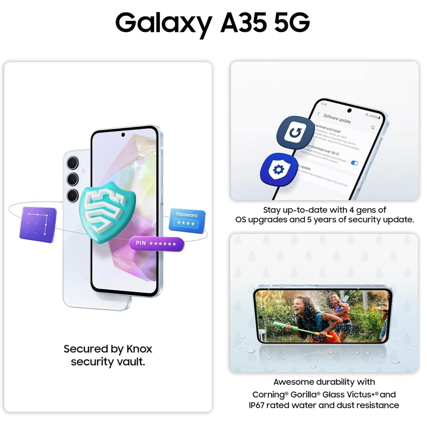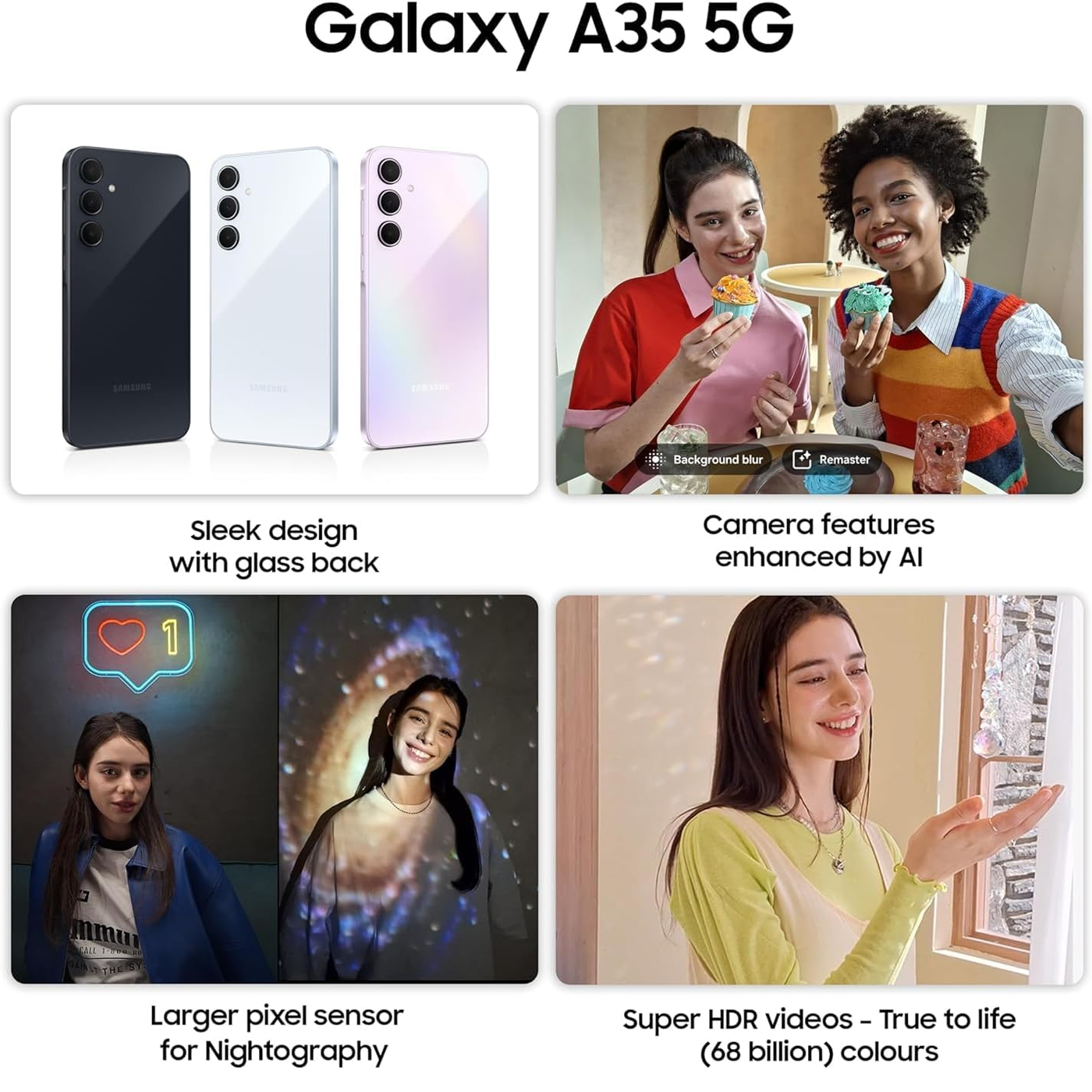 The Samsung Galaxy A35 5G features an iconic design with a 50MP high-resolution Wide-angle camera, enhanced sensors for low-light photography, Super HDR technology for videos, and smooth video stabilization. It’s powered by an Octa-core processor and offers internal storage options of 128GB or 256GB, with support for a microSD card slot up to 1TB.