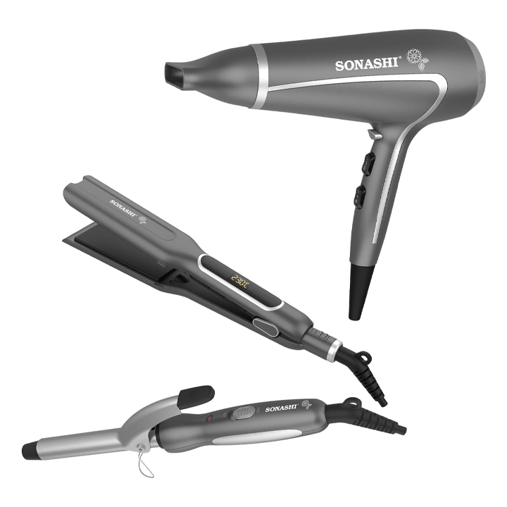 Sonashi 3 in1 Hair Dressing Set With Hair Dryer Hair Straightener And Hair Curler Featured With Ceramic Plates Wet And Dry Function Light Indicator 360 Swivel SBS-800 Grey