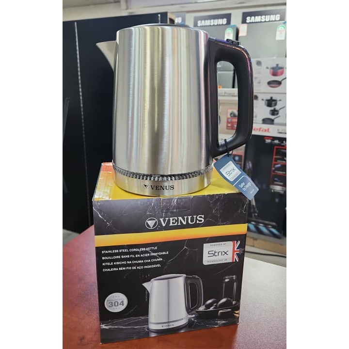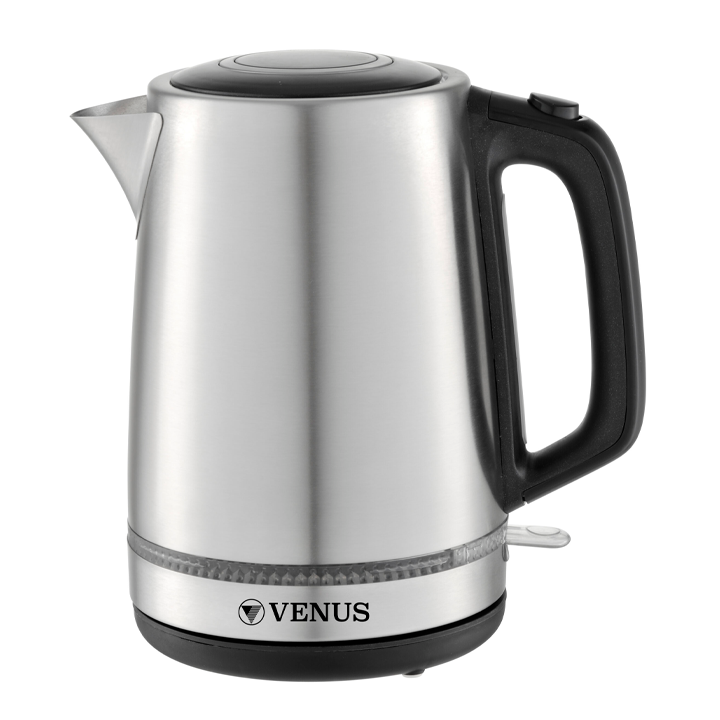 Introducing the Venus 1.8-liter cordless kettle, crafted with a UK STRIX controller for reliable performance and longevity. Its brushed stainless-steel exterior adds a touch of elegance to any kitchen or office space. The kettle features a water level indicator for easy monitoring and precise filling. For safety and convenience, it includes automatic shut-off and an automatic top lid. Each unit operates at 220V, 60Hz, and 220W power, making it suitable for various environments.